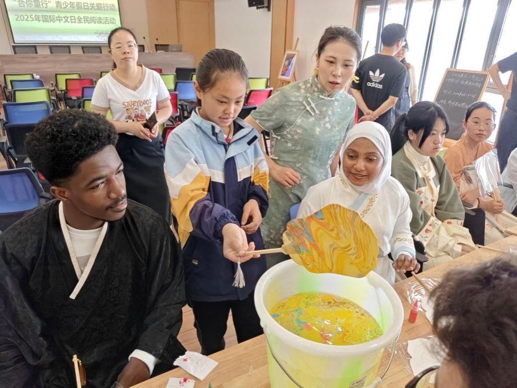 在非遗工坊体验区,留学生们与中国的小朋友一起体验制作漆扇。在老师指导下,大家小心翼翼地调制漆料、绘制图案,每一步都倾注着留学生们对中国传统技艺的好奇与热爱,都让他们深度领略到中国传统工艺的精妙与匠心。